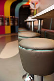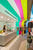 The self-serve yogurt concept calls for a particular circulation pattern in which customers cycle through the space from the dispensers, to the toppings, to the cashier. The ceiling pattern draws customers in from the street to the yogurt selection at the back of the narrow space. The progression of the circulation flow is reinforced through a secondary, more subtle, pattern in the floor.
